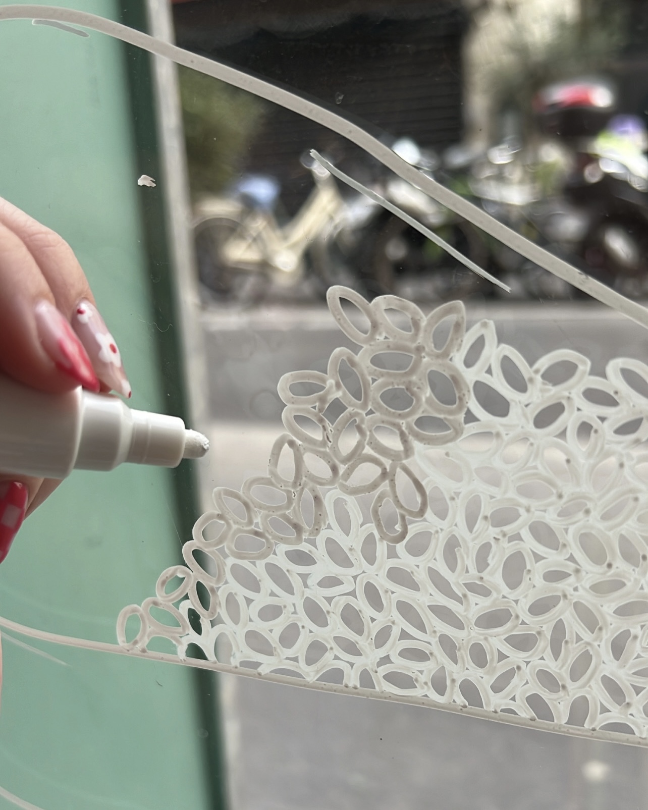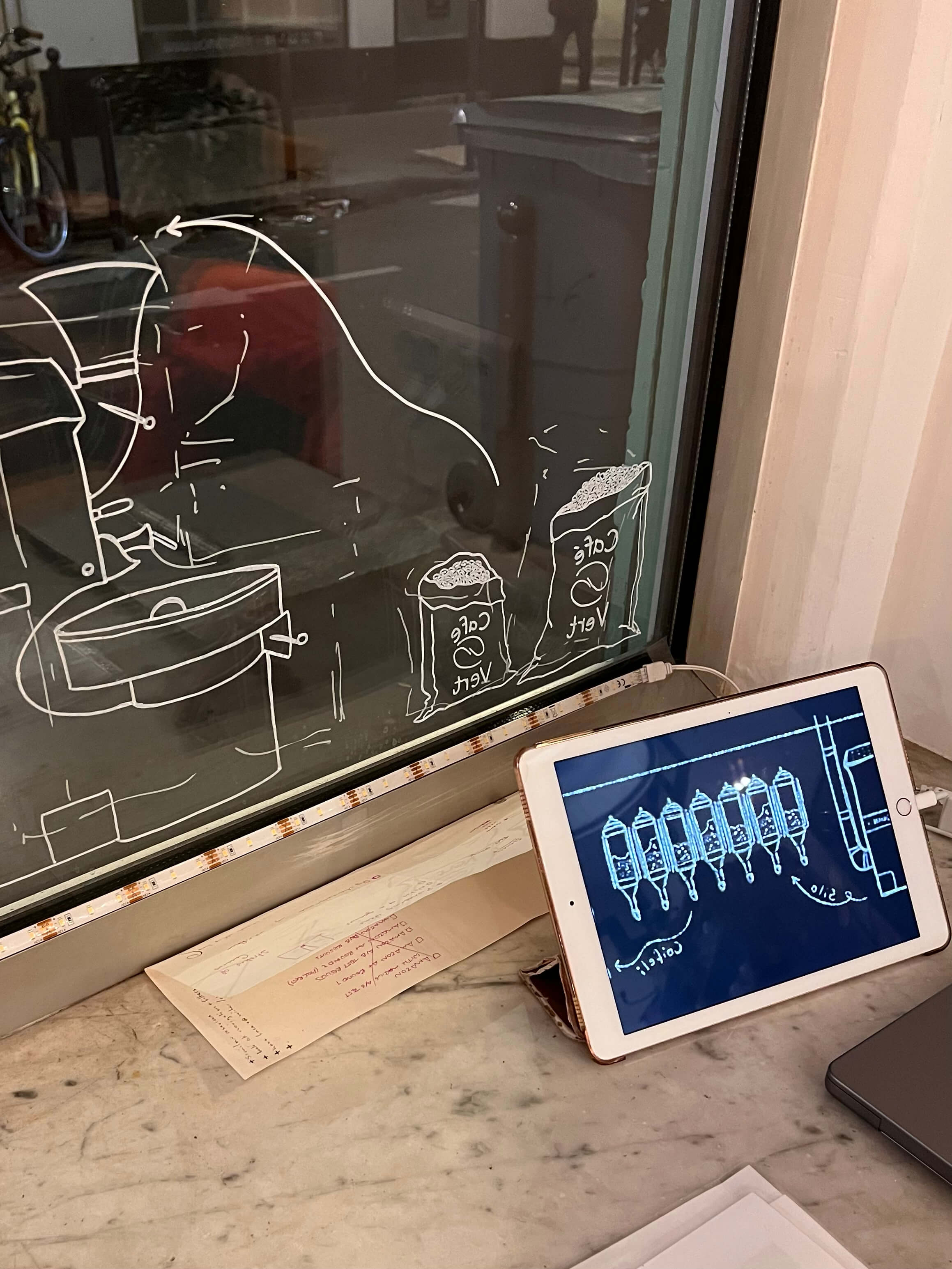 Scroll down for more captivating process photos. I learnt a lot during this project, some communication difficulties with my lack of good french, but most importantly, it taught me how to get a feel for the business’s passion and preferences. Learning the time frames for both the initial sketching and idea phase, as well as the final implementation of drawing on the window itself. Firstly, I photograph the space and, using Procreate, created digital overlays of ideas and rough sketches until both Café Vert and I were happy with the final concept. Lastly, we selected a day that would cause minimal disruption to draw the final artwork on the window.