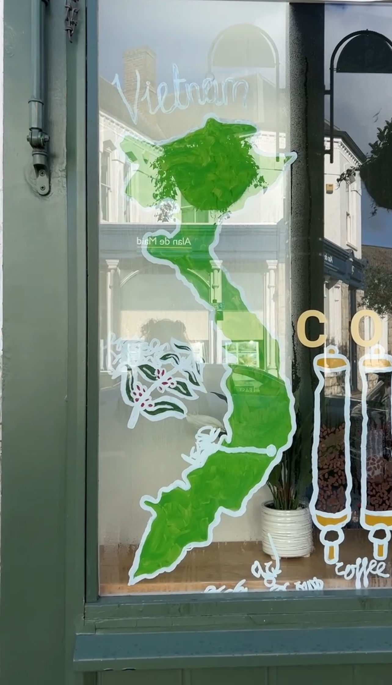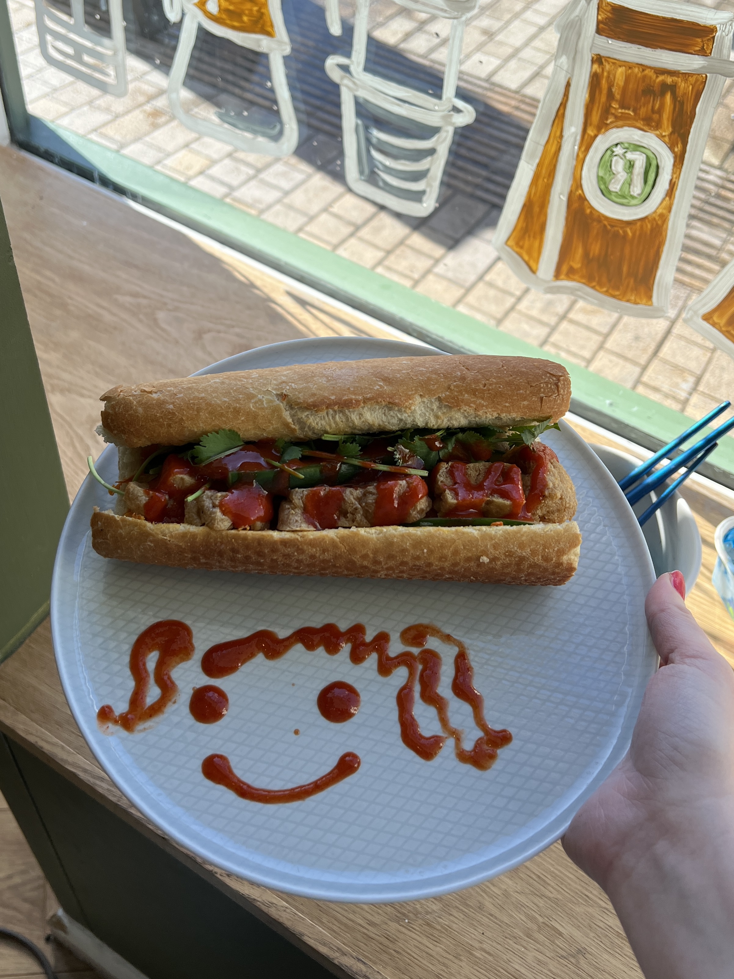 The third window on the right has everything café related. From the cakes and pastries to the Conti coffee machine! Here we highlight the fact you can sit in or take away, as well as the multiple food options of bánh mì, sandwiches, toasties, pancakes, cakes and pastries. Obviously I painted a croissant here, if you know, you know.