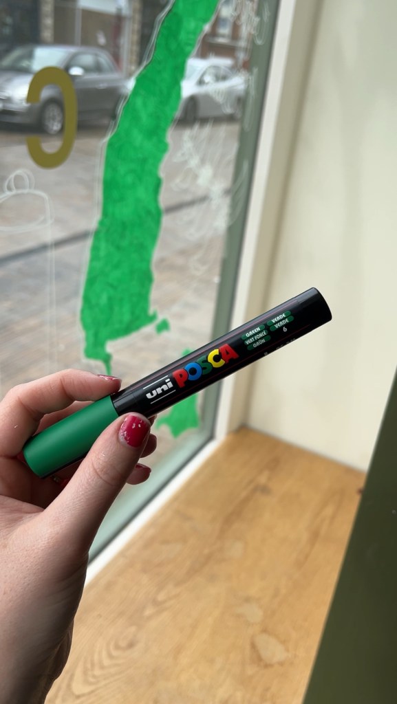 Of course, no project is without its challenges. Midway through the painting process, I encountered an very unexpected hurdle. The weather outside. I know, I’m painting inside, how has the outside affecting me?! Turns out with old windows, the direction the windows faced with the sun and having a steamy coffee shop, condensation began to sink and peel off the paint!! 😱 It was sooooooo frustrating. I came back to see my work mangled and peeling off. We took some very deep breaths, and with determination to not let myself and Roastar down, I found a solution. POSCA pens! I’d been painting with acrylic and I think the weight of it and any parts I’d painted with a slightly watery brush were ruined with condensation.