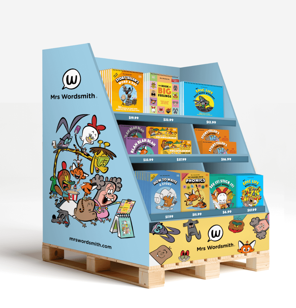 Seeing how these playful mock-ups have helped bring our products to life across all our channels – from email headers to social posts to google ads! The product pallete stand design mock successfully landed Mrs Wordsmith space in a major US retailer store, proving that making education fun can look pretty epic too.